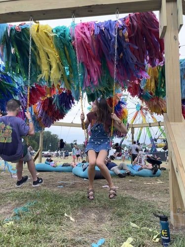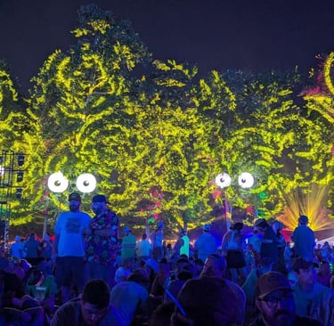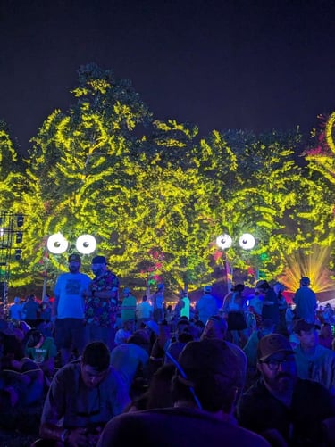 The Moma Dance, an iconic Mondegreen, was only the first night opener, and already the energy was high. I’ve also never seen a crowd boogie like that - everyone was moving, from the smallest head bobs to the more common full-body flails. The set list was never the same, and the music flowed and tripped over itself and spun in the air above our heads. The sun went down and everything lit up, purple trees and spinning prisms, transporting us into an alien world where the only thing there was and could ever be to do was dance. The only thing to do was laugh as the band pulled out trampolines and started bouncing on them and playing. Who even does that? Glow sticks illuminated the ground from below and the best light display I’ve ever seen unfolded before my eyes. Ten minute songs became all too short as the stage picked up my mind on a wave of energy and carried it towards the band. Each night was a celebration of being alive, a strange and wonderful carnival built just for our delight.