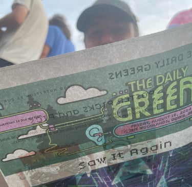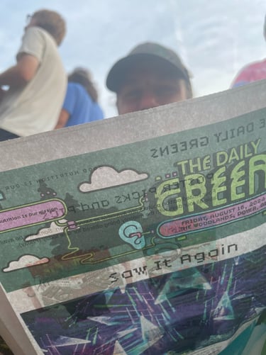 Inside the festival was a city hall constructed entirely of cardboard to the left, a ferris wheel to the right, the stage in front, and a heliograph behind. Vendors and hammocks watched over by T.J. Eckleburg-esque eyes staring from the trees. People could wander through and get a Phish-themed tattoo, spend a couple hours at a spa, and pick up the Daily Greens, a goings-on newspaper for the festival. Then the concert started and people packed in around the stage for what seemed like miles. But everyone left ample dancing space for themselves and their neighbors, as the night would soon warrant.