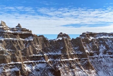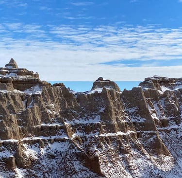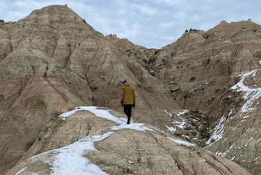 I figured the Badlands in January were kind of a gamble, but it turned out better than I thought. The park was next to empty, the harsh land outlined by streams of silvery white. We could have been the only people in the world, hiking Notch Trail and Cliff Shelf Trail, breathless from the icy air and the view. Saddle Pass Trail was our exit hike, and we slipped and slid in the coating of mud on the trail made by the melting snow, but we were determined. The view from the top was beautiful, the tiny road we took into the park winding its way over the horizon. How small we must all seem to the eagles, who know the whole map by instinct and spirit.